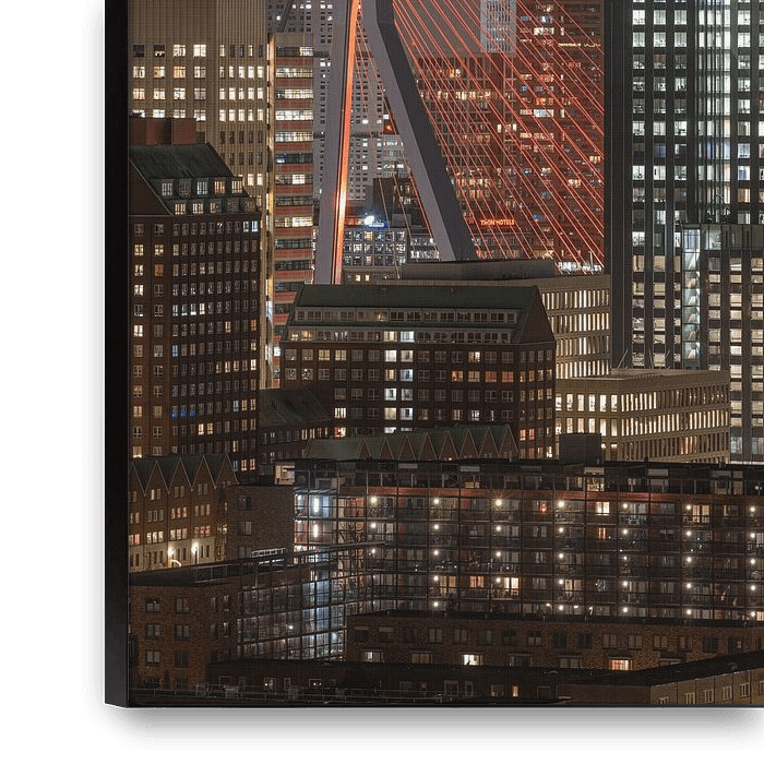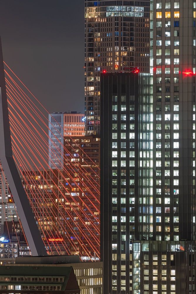 The Erasmus Bridge in orange in Rotterdam with the Zalmhaven Tower and Maastoren (|). An impressive photo of the Erasmus Bridge in Rotterdam, fully illuminated in orange, with the iconic bridge on the right and the imposing Zalmhavenentoren and Maastoren on the left forming a beautiful cityscape. This work is part of the photographic…