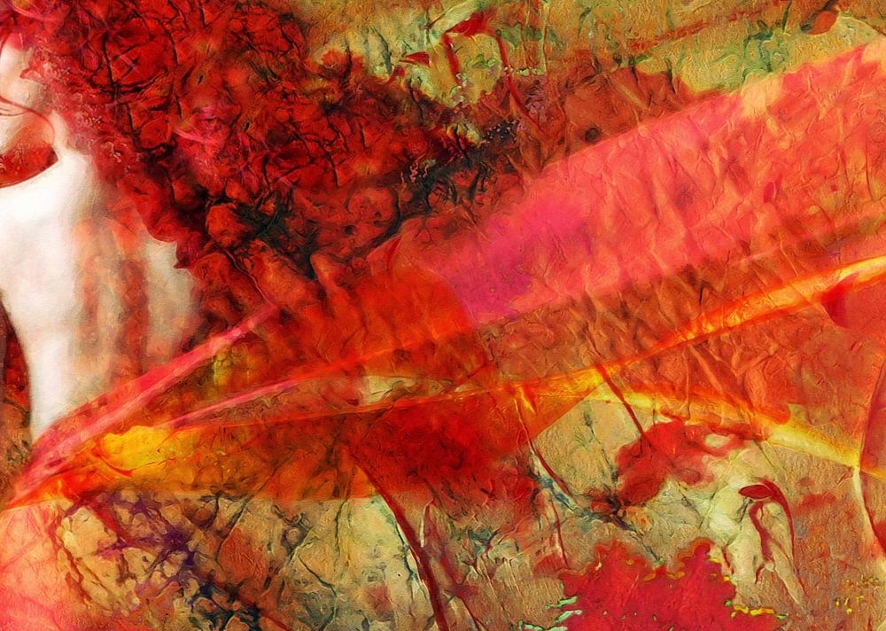 Colorful abstract painting in red and gold tones with coarse texture and brush strokes on canvas and with the concept of emotion and passion