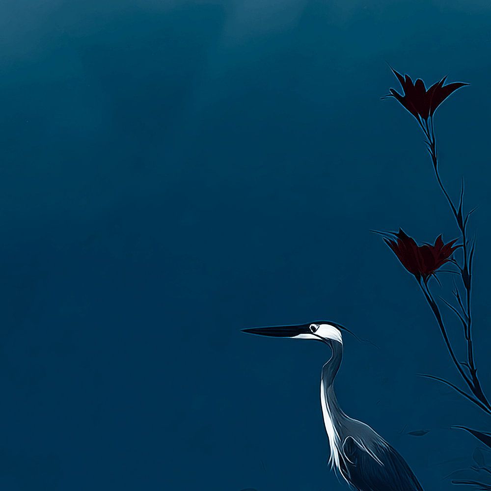 Serene and melancholic artwork of a lone heron standing on a snowy rock in a deep blue, misty winter world with some red flowers - ideal as…