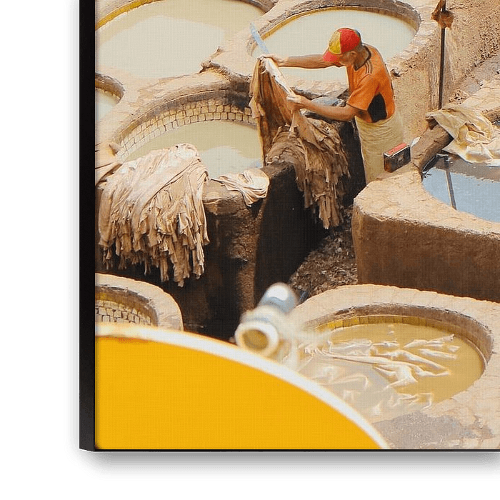 An atmospheric photo of the famous tanneries in Fez, Morocco. The warm earth tones and the rhythm of the round tanning beds tell the story of centuries-old craftsmanship. This wall art brings a touch of exotic authenticity into your home—perfect for a living room, office, or boutique hotel with a cosmopolitan or natural feel.