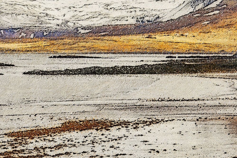 This digital painting is an adaptation of a photograph taken somewhere along that coastline. To be exact, near the town of Olafsvik, on the north coast of the Snæfellsnes peninsula. A composition of nature, with seven components: waves, seaweed, sand, rocks, grass, snow and clouds.