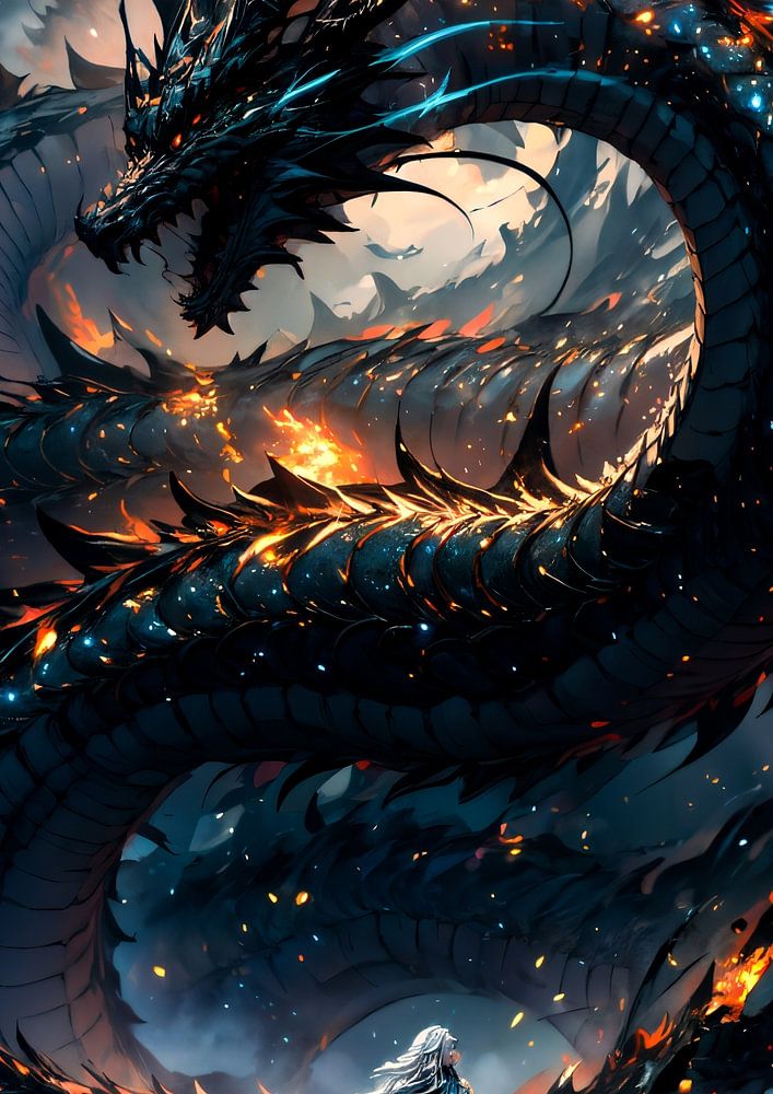 A colossal dragon of fire and shadow descends from the burning sky, herald of ruin and rebirth. Darkness and flame entwine in this epic vision of destruction and awe. A titanic dragon coils through the inferno of a shattered world, its scales glowing with molten fire as it encircles a lone figure standing amidst the chaos. A dramatic embodiment of apocalypse, transformation, and raw elemental fury — perfect for lovers of dark fantasy and mythic storytelling.