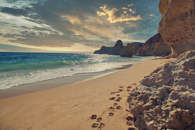 Sunset over Praia Marinha, Algarve, Portugal. Footprints on the beach and sunset in warm tones.