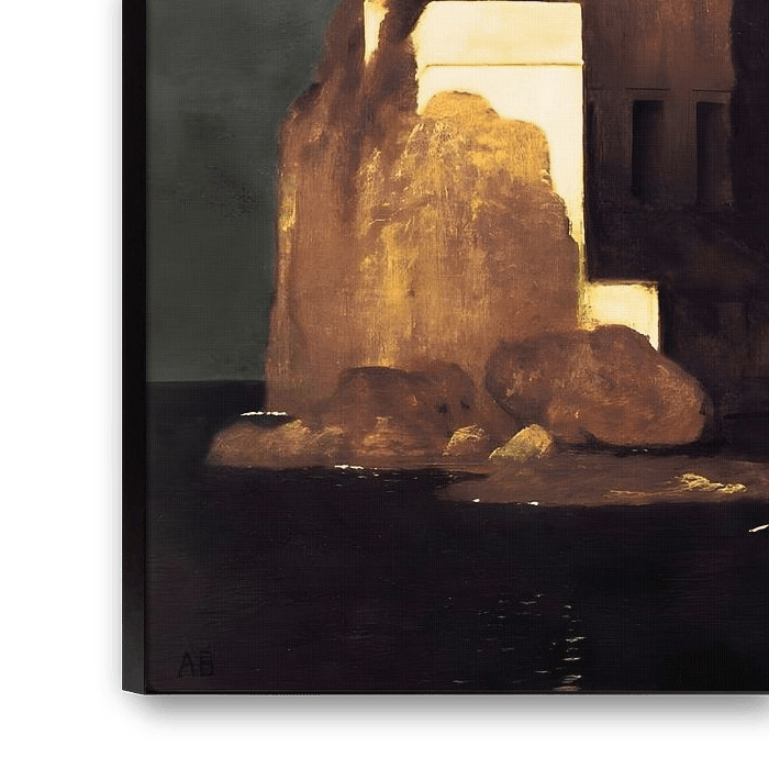 The Isle of the Dead" is the most famous work by the Swiss Symbolist painter Arnold Böcklin, who painted five versions between 1880 and 1886. The painting depicts a desolate, rocky island dominated by towering cypress trees, traditional symbols of mourning and cemeteries. A small rowboat approaches a water gate, carrying a coffin and a standing figure shrouded in white, guided by an oarsman often interpreted as Charon, the ferryman of the underworld from Greek mythology.