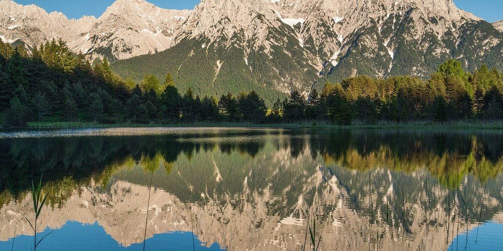 The Karwendel mountains reflected in a crystal clear mountain lake near Mittenwald, Upper Bavaria, Germany