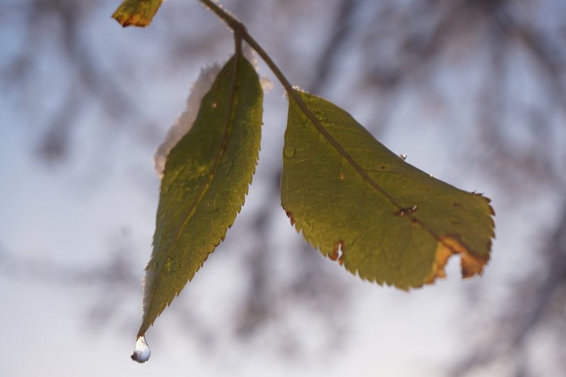 The last leaves clinging to the branches during the winter. The snow is beginning to melt, and it looks as though they have survived. The last drop falls from their shoulders.