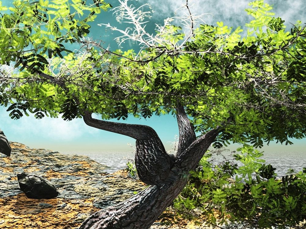 The tree, with its twisted branches and lush foliage, symbolises the survival and resilience of nature in an otherwise hostile environment. This depiction reminds us how precious and fragile life is on our own planet.