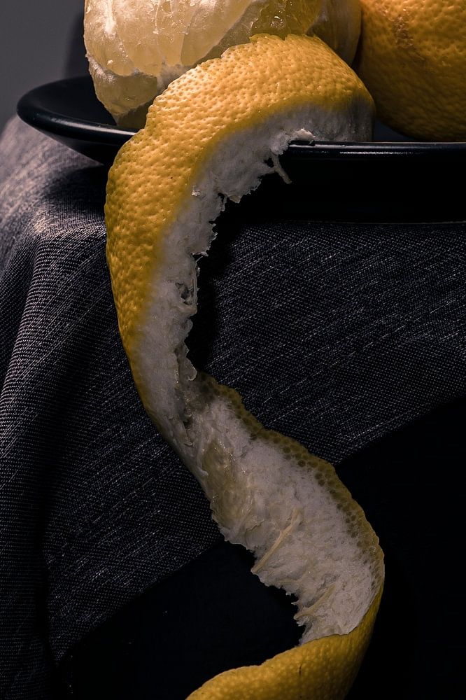 Still life of 2 lemons, one of them peeled and lightly placed on a saucer. With a wink to the still lifes from the seventeenth century painting.