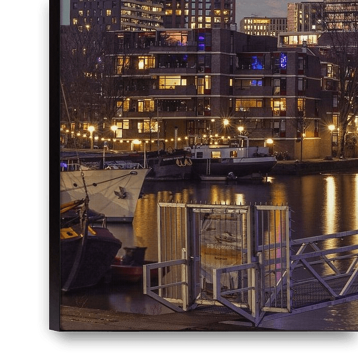This impressive city photo captures the magic of Rotterdam at sunset, with a breathtaking view of the Leuvehaven. As evening falls, the modern high-rises and atmospheric quay lights light up, creating a beautiful contrast with the warm colours of the sky. The reflections in the water enhance the dynamic aura of this vibrant…