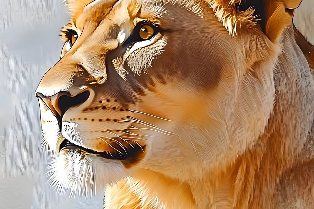 A painting shows an imposing lion, drawn with chalky lines that emphasise the animal's strength and majesty. The chalk texture gives it a rough, wild look, while the lion's intense gaze contrasts with the minimalist background. The chalk-like technique brings the lion to life in all its ferocious splendour.