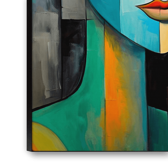 An artwork of an abstract woman with large eyes in the style of modern cubism. The background is simple, creating contrast. Her sharp features give depth to her expression.