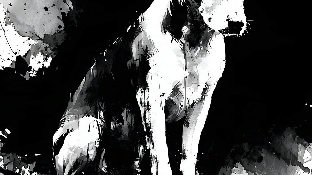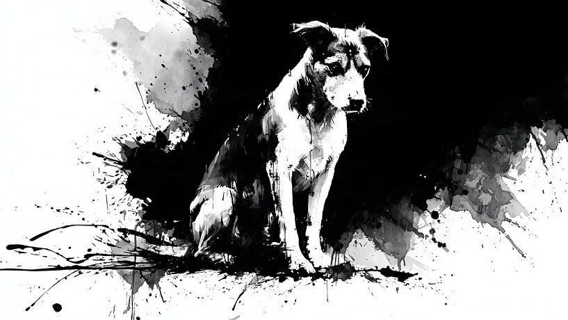 The dog remains motionless, its posture calm yet surrendered. The dissolving body suggests fading boundaries between self and attachment.