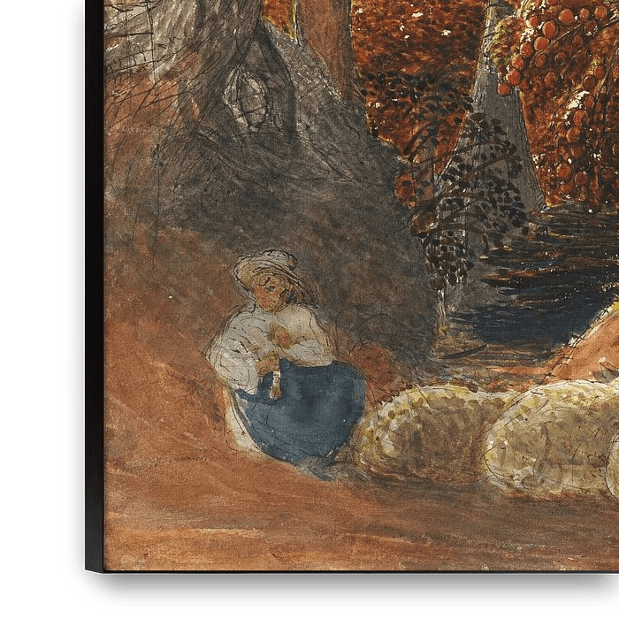 This watercolour belongs to Palmer’s so-called ‘Visionary’ period, c.1826-32, when he was painting some of his most intense and original landscapes inspired by the scenery of Shoreham in Kent. Reacting against the work of contemporary watercolourists, which he found lacking in profundity, Palmer retreated to the Kent Weald where the landscape offered him a taste of those ‘properties’ in nature which, he said, ‘lie still deeper’.