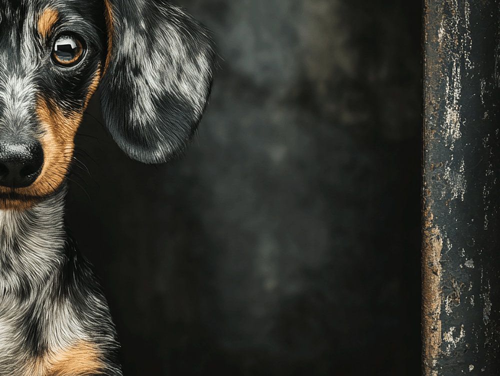 Beautiful dramatic portrait of a black-grey-brown spotted (merle) dachshund resting his front paws on a weathered old window frame and looking straight at you, ideal as intense wall decoration.