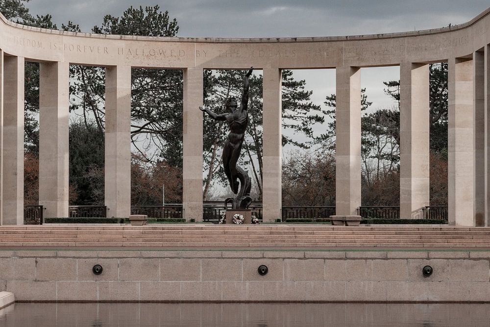 At the Normandy American Cemetery and Memorial, an imposing monument commemorates the enormous courage and sacrifice of the US soldiers who gave their lives during the invasion of Normandy on D-Day. This monument, erected in memory of the 9,387 soldiers killed, stands proudly in the centre of the cemetery and is a symbol of the price of freedom. The monument is decorated with statues of US soldiers and inscriptions highlighting the sacrifice of these men.