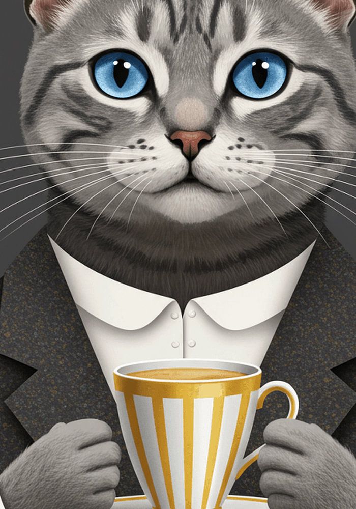 A beautifully composed portrait featuring an elegant Grey Tabby with piercing blue eyes, impeccably dressed in a tailored tweed suit and crisp white collar. The figure holds a delicate white and gold-striped teacup and saucer, ready for a spot of high tea. With its neutral palette and classic attire, this artwork offers a delightful blend of British charm and sophisticated whimsy. An ideal piece for a breakfast nook, a formal dining area, or a gallery wall seeking a touch of timeless, refined humor.
