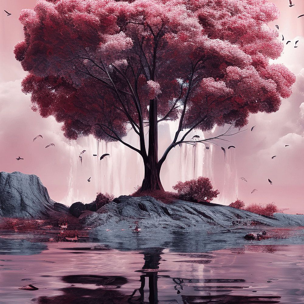 A surreal image of a pink tree on an island in the middle of a pink sea with birds flying around it. The image evokes a sense of wonder and beauty.