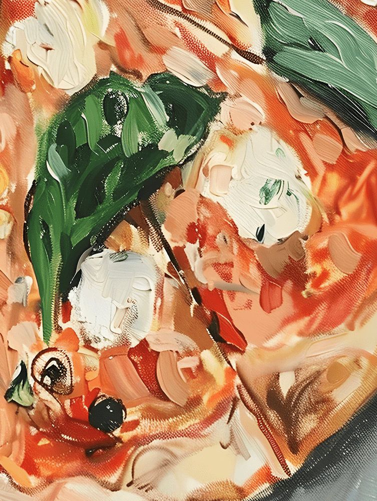 In this artwork, a delicious pizza is brought to life in a mix of warm and soft colours and tones, which blend together beautifully and evoke the warm atmosphere.