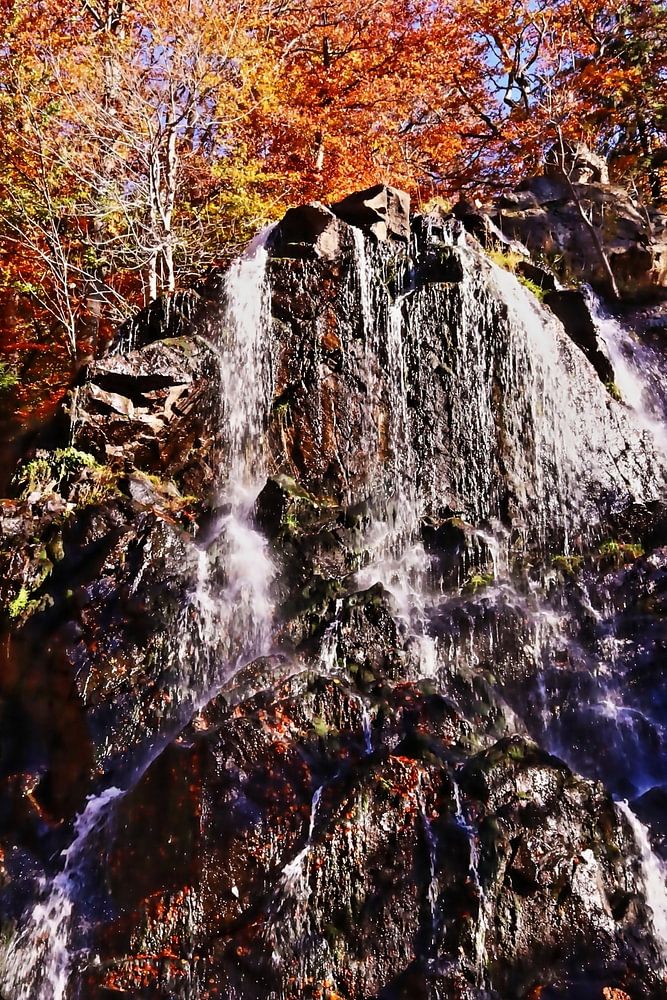 The photo shows the Radau waterfall in the Harz Mountains wrapped in autumn colors.
