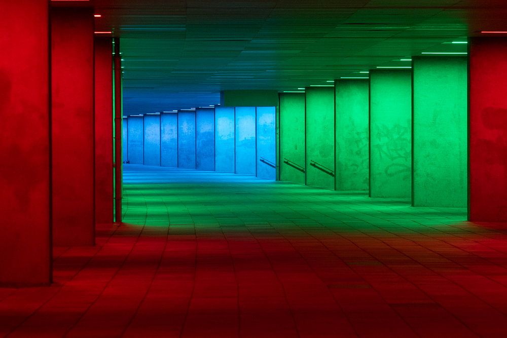 Rotterdam, August 2020. The gallery is located in the centre of Rotterdam. Grey and grey during the day, but beautifully illuminated with different colours in the evening.