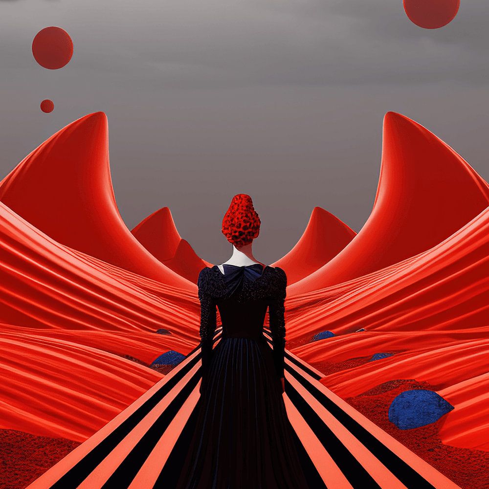 A surreal image of a woman walking down a red road with giant spheres in the background.