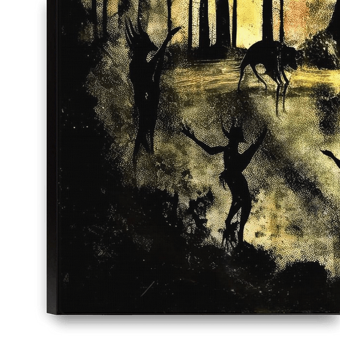 A haunting and obscure artwork depicting a dark ritual in the midst of a forest, where multiple entities gather to summon a malevolent presence. The piece is saturated in black with tints of yellow and sepia, adding to the eerie atmosphere. Details of the image could be described as symbolism, occultism, black magic and ritualistic, as…