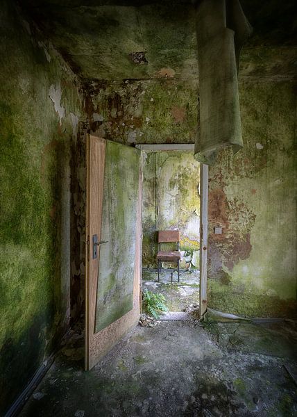 Green deposits creep across the ceilings and walls as if nature has taken over the conversation. The door is still half open, like an invitation to come in that was never accepted. In the middle of the room stands a chair, without explanation, without function.