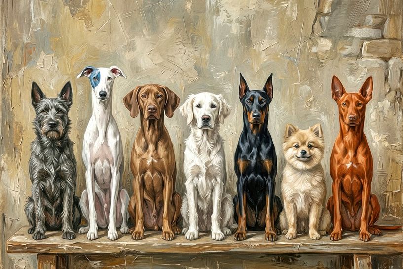 A group of seven different dogs are sitting neatly in a row on a wooden bench. Each dog represents a unique breed and colour, lending the scene a special charm.