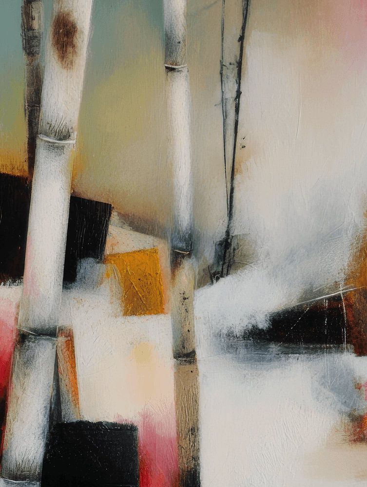 An atmospheric abstract bamboo landscape, where natural shapes meet modern colours. The vertical lines of the bamboo create calm and balance, while the lively accents in red, orange and pink provide warmth and energy. A work of art that exudes both calmness and strength, giving any interior an elegant, contemporary feel.