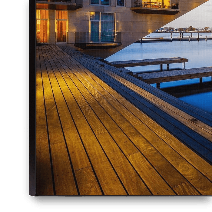 Buy this modern artwork The Sluishuis in Amsterdam during the blue hour in the Netherlands by Bart Ros on canvas, ArtFrame, poster and wallpaper, printed on demand in high quality.