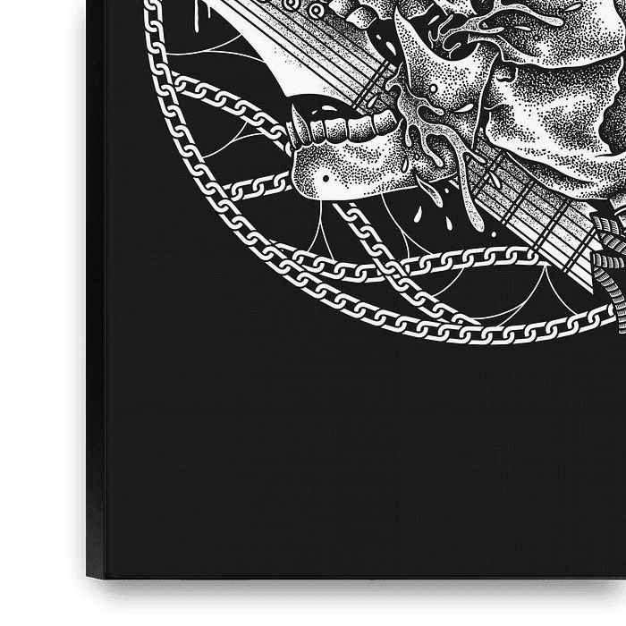 The central focus is a powerful combination of skulls and guitar elements, rendered in a stark, high-contrast black-and-white palette.