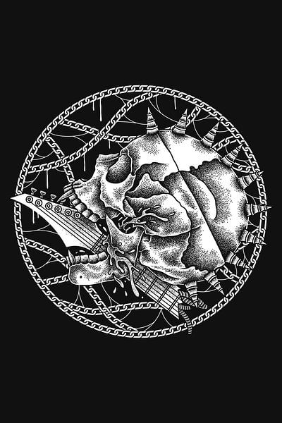 Step into a world of primal sound and dark craftsmanship with this intricately detailed stippling illustration.