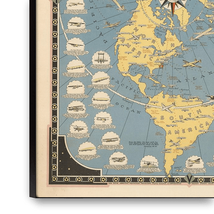 The story map of flying : Being a chronicle of man's conquest of the air. Color pictorial map, mounted on linen. Polar Azimuthal Equidistant Projection. Filled with drawings and images of flying machines with descriptive text, dated 674-1942. Includes notes and compass rose in the center of Arctic Circle.