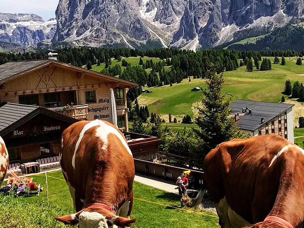 Picture of 3 cows in the mountains. Photo was taken on the Seiseralm, a mountain in the Dolomites in Italy during our trip through Europe in 2017.
