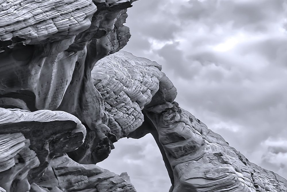 An hour's drive from Las Vegas are the fire-red rock formations of the Valley of Fire. Sandstone eroded by erosion has created the most fantastic shapes that only nature can imagine. Rock formations with names like Beehive and Elephant Rock and the Arch Rock pictured here in black and white make a visit more than worthwhile.