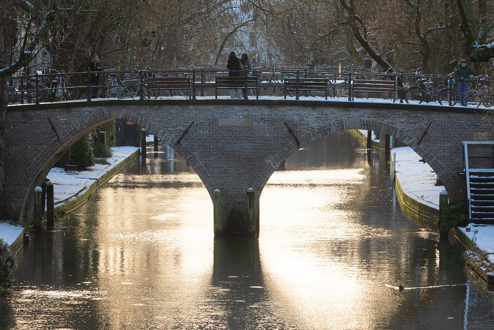 The Weesbrug in Utrecht in winter backlight (landscape). Photo taken by Utrecht photographer André Blom on Sunday 4 January 2026. A real winter morning with snow! Photo taken from the Hamburger Bridge over the Oudegracht canal.