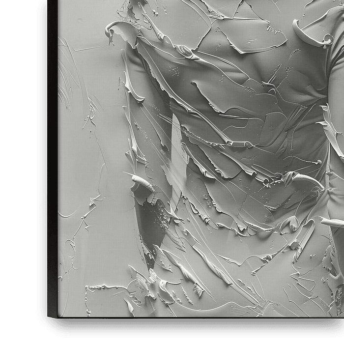 It depicts a woman from behind, whose face is partially averted. The focus is on the vivid and rough application of grey and white paint, which emphasises the contours of her clothes and hair. The woman's hair is wild and blowing…