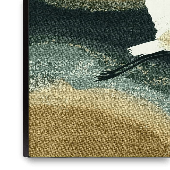 This sophisticated and luxurious artwork, The White Heron over the Golden River, shows an elegant white heron in full flight over an abstract river of liquid gold, turquoise and sand and warm earth…