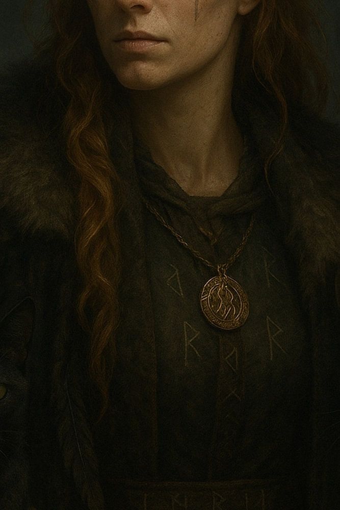 A strong woman stands proudly in a dim forest, flanked by two cats - one black and one striped. Her eyes gaze determinedly into the distance, while runic characters adorn her skin and clothing. In her hand a spear, around her neck an amulet alluding to deep symbolism and ancient rituals. This work evokes the energy of a priestess, a warrioress, or a guardian of ancient wisdom. The inspiration comes from Nordic mythology, but the image remains universal. The mood is mysterious, powerful and spiritual. In the interior, this image brings balance, feminine power and a touch of magic. Perfect for lovers of mythical symbolism, shamanic energy or meaningful art with a story.