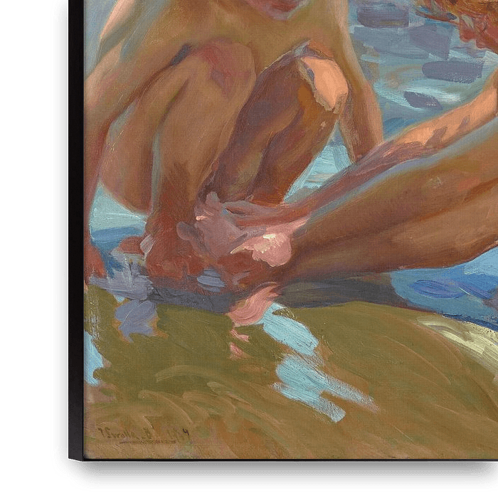 While on the beach at Valencia,Joaquín Sorolla y Bastida rapidly painted a group of pictures including The Wounded Foot. Like the Impressionists before him, Sorolla worked outdoors to capture the momentary effects of light, water, and people in motion. This painting's casual snapshot-like cropping, which cuts off the arm of the child at the left, gives the viewer the same sense of immediacy, as if he or she has accidentally happened upon an impromptu exchange between two children on the sand.