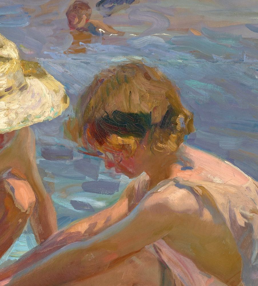 The colored reflections of late afternoon light animate this beach scene and actively define the forms, from the injured child's shoulder to the liquid sea and the figures playing in the water. The sun's highlights on the hurt child's hand, the sand around her foot, and her companion's hat draw the viewer's attention to the injured limb.