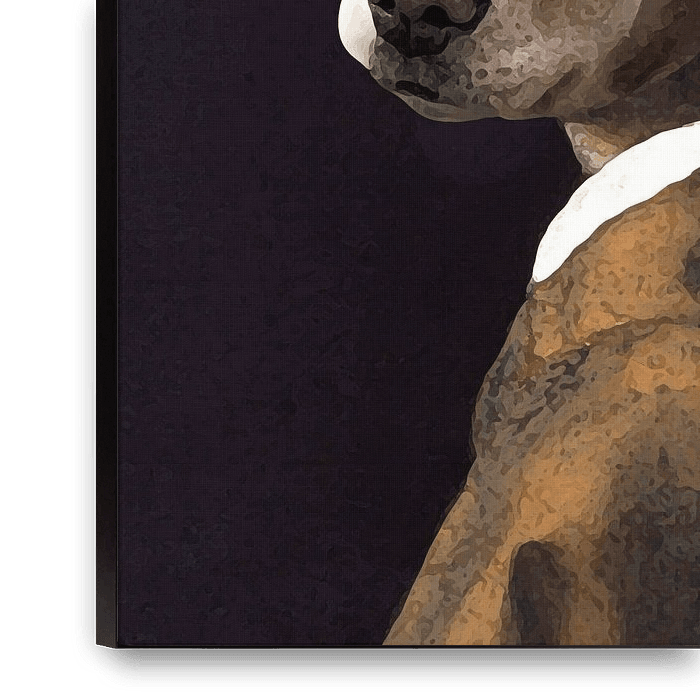 A bitch in the style of the Old Masters inspired by the artwork "The girl with the pearl earring" (Meisje met de parel) by Jan Vermeer as a painting on pleasant dark background.