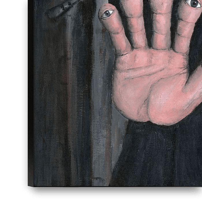A surrealistic acrylic painting of a person standing in a wooded area. He has no eyes in his face but he has eyes on his fingers. His hand is held out in front of him so the eyes can see in front of him.