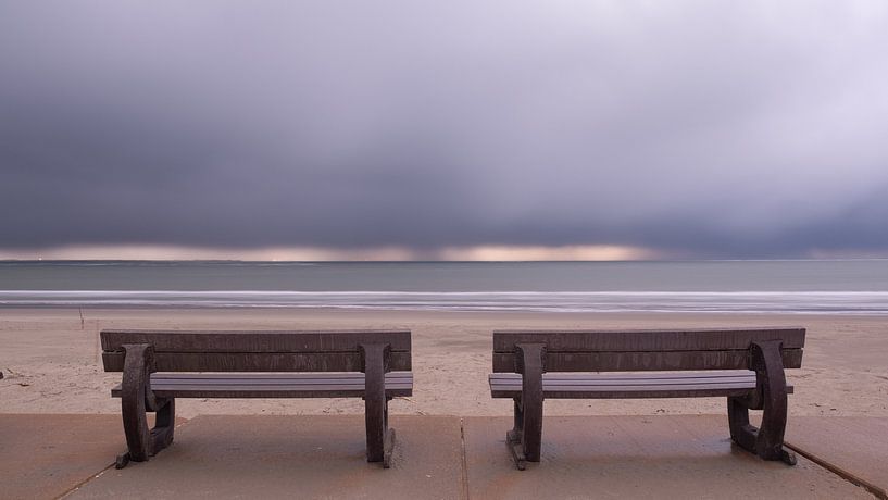 On the beach at Ameland, there are two benches offering a magnificent view of the sea. The ominous sky, combined with the setting sun, makes the calm before the storm almost palpable. There is nothing in the frame to distract the eye.