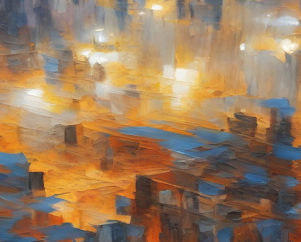 "Experience urban splendour in all its glory with this beautifully crafted artwork. The vibrant impasto technique brings the texture of buildings to life, while abstract elements add a mysterious depth to the nightscape. With thoughtful use of the dry brush technique, the city's lights are subtly accentuated, creating an enchanting spectacle of shadows and shimmering lights. This celestial rendering of a city at night brings a unique atmosphere to any room.