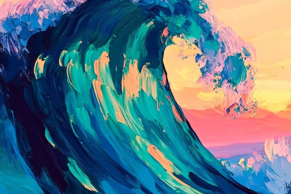 With vibrant green tones and dynamic brushstrokes, a majestic wave unfolds in an interplay with the soft colours of the sunset. This powerful depiction brings a sense of freedom and movement to the room. Perfect for a modern living room, it adds a touch of maritime elegance to any moment.