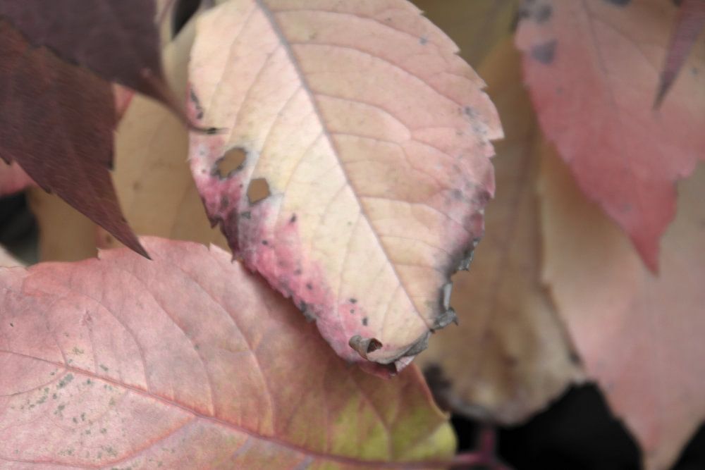 Red foliage stretches through a green hedge of ivy, heralding the start of autumn.