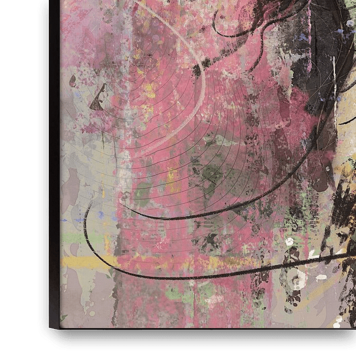 A charcoal drawing of an abstract female figure turned into colourful digital artwork. With lots of pink, lilac, green and warm shades of grey.