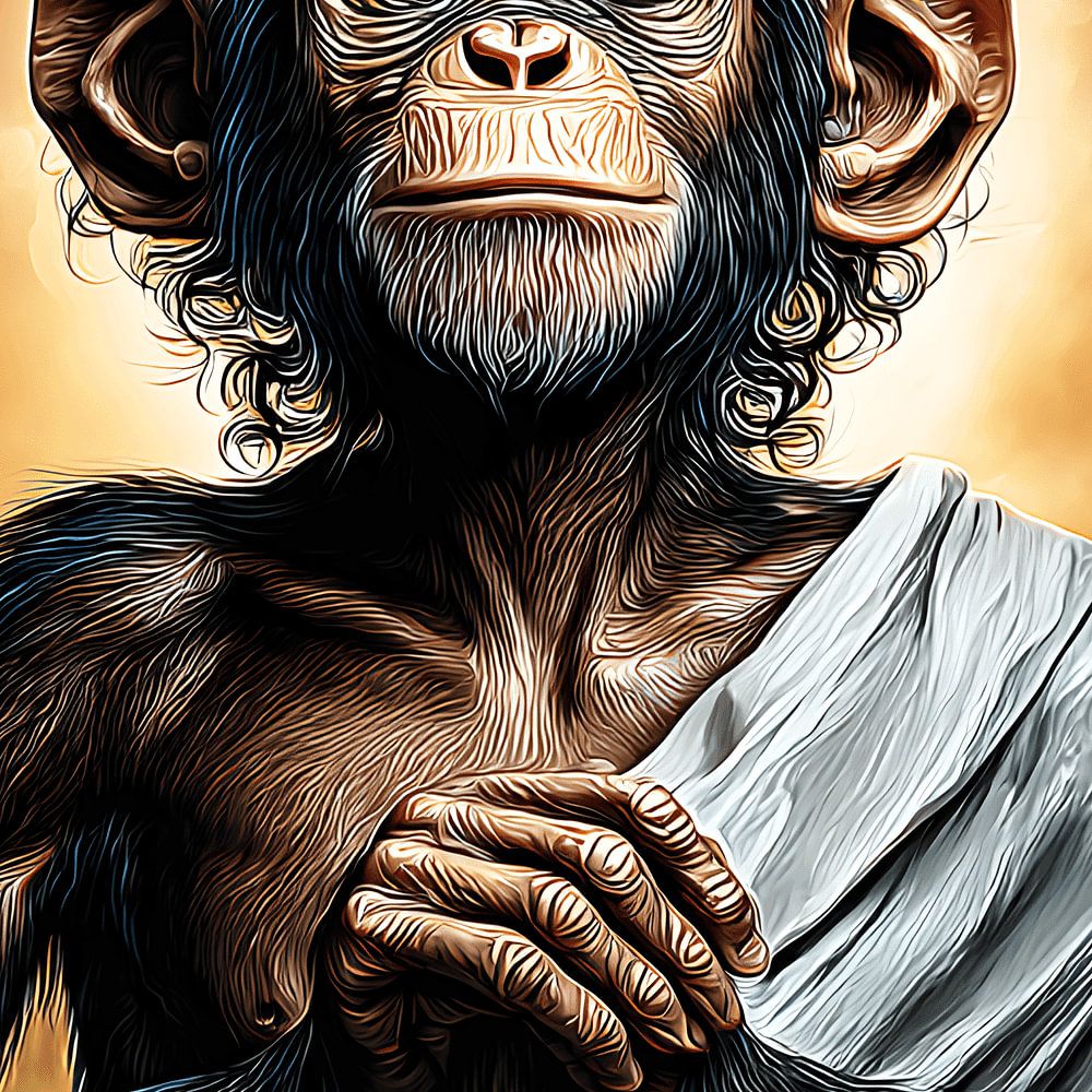 An impressive fusion of evolution, spirituality and rebellion, "The Enlightened Primate" depicts a serene, wise chimpanzee wrapped in a shawl, standing before a radiant halo as his followers gather behind him. This image captures the moment of awakening - when instinct meets consciousness and leadership transcends the boundaries of the species.