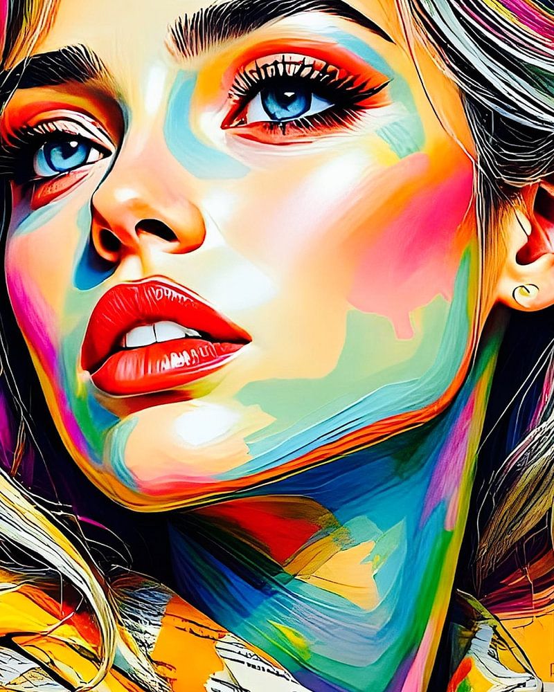 The combination of photography and painting, together with the different techniques, creates a sense of movement and dynamism, while the model acts as a central element. It appears to emerge from the canvas and absorb the energy of the background. This innovative blend of media and styles not only showcases the artist's creativity, but also stimulates the viewer's imagination and invites a deep engagement with the subject matter depicted.